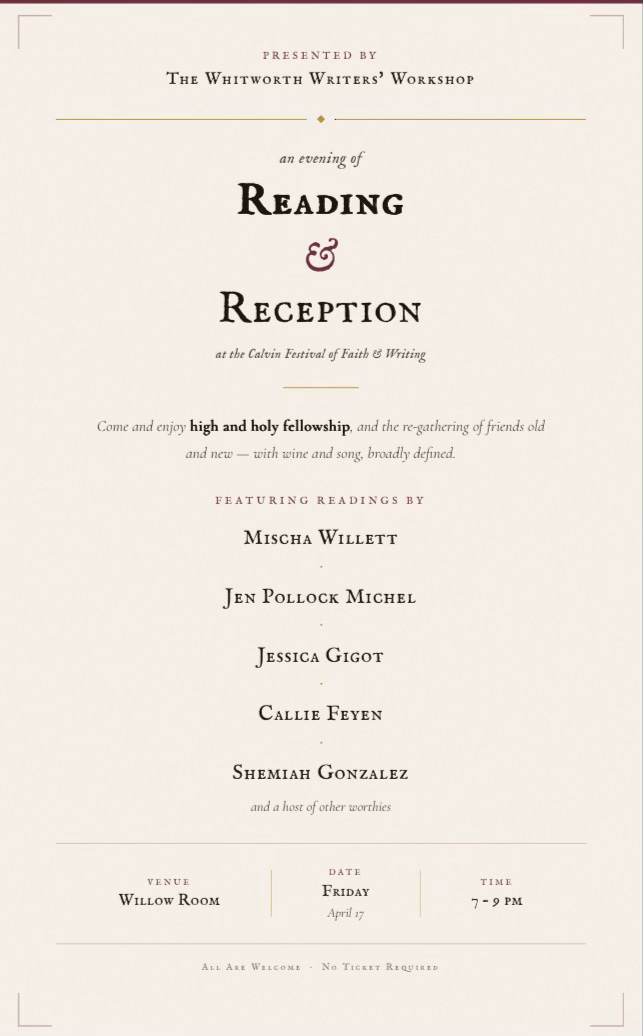 April 15-18 Calvin Festival of Faith and Writing Grand Rapids, MI